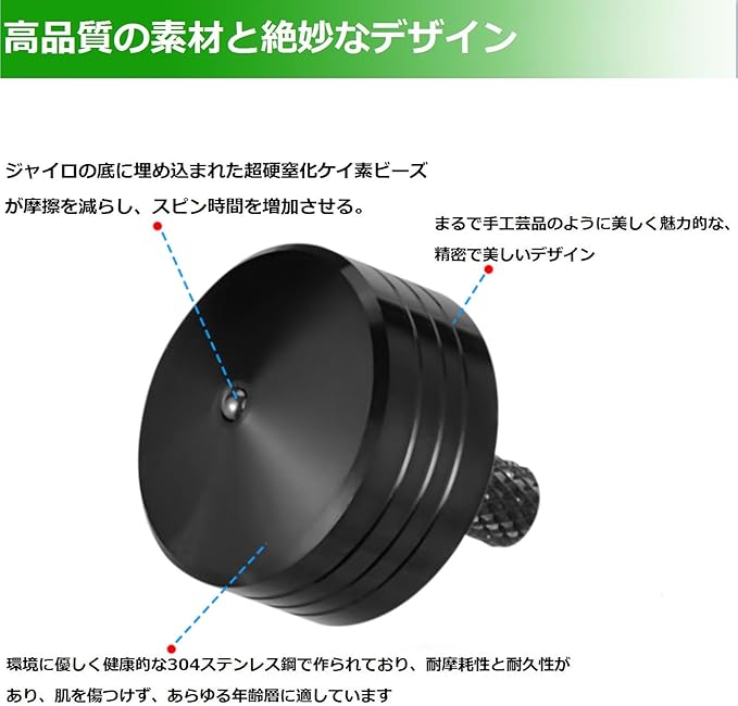 ★高品質:ステンレス鋼製で、錆びや変色の特性がありません。 CNC旋盤精密加工、一体成形、絶妙なスタイル、バリなし。 最も硬い窒化ケイ素が底にはめ込まれており、非常に丈夫で耐久性があります。 ローレット加工を施したトップボディにより、グリップ力が向上し、スピン時間が長くなります。
