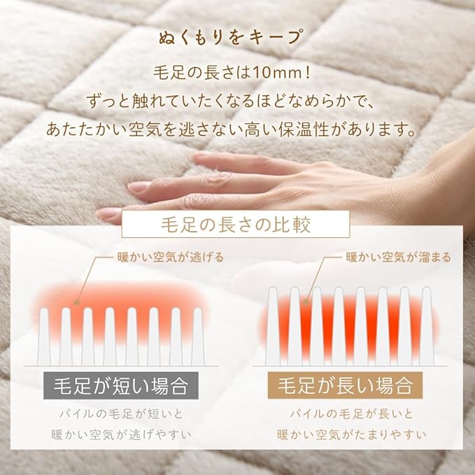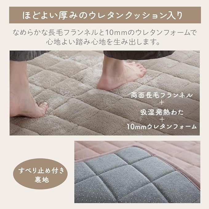 材質 表:毛羽部分:ポリエステル100%(フランネル長毛マイクロ330g/m2) グランド部分:ポリエステル100% 中綿:ポリエステル100%吸湿発熱綿 洗えるウレタン20D 10mm 裏:不織布滑り止め付き