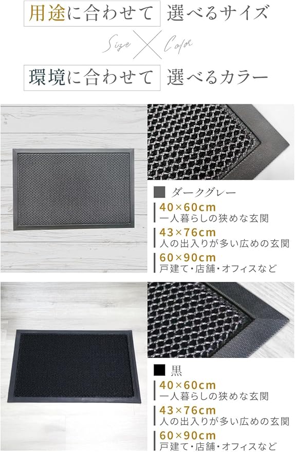 ✅【どんな場所にもなじむシンプルデザイン】 落ち着いたブラックとダークグレーの2色とすっきりとしたフォルムで、住宅玄関はもちろん、事務所や商業施設の出入り口にもピッタリです。複数枚並べて広い玄関や通路にも対応可能な屋外マットです。