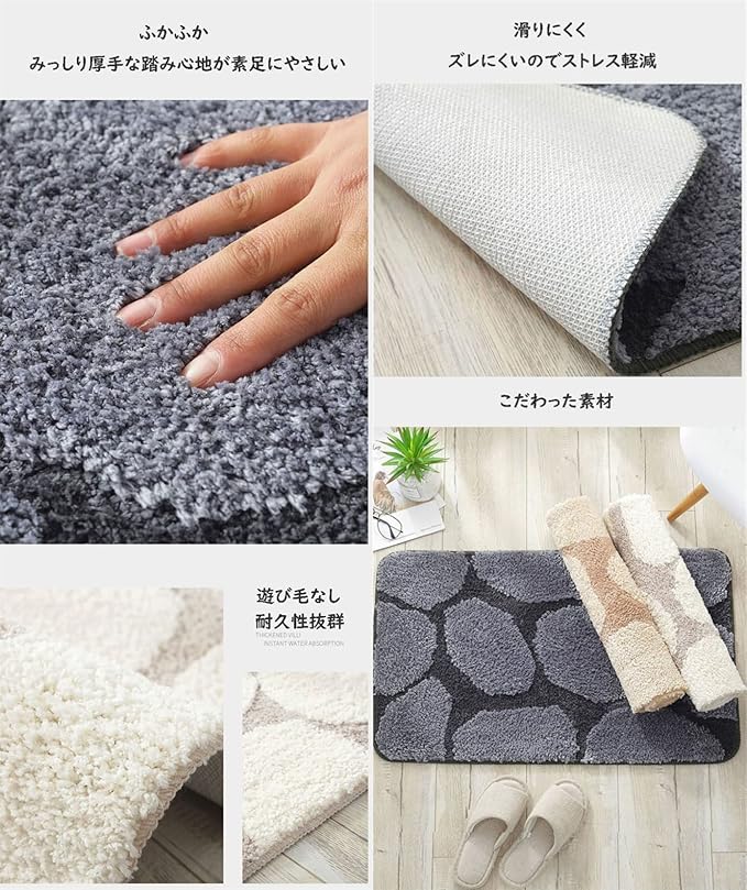 【ふわふわ】バスマットは濃密なマイクロファイバー素材(超極細繊維)を採用し、抜群の通気性を持ち、細菌の増殖を抑制できます。毛足のふわふわ触りごこちが気持ちがいいです。