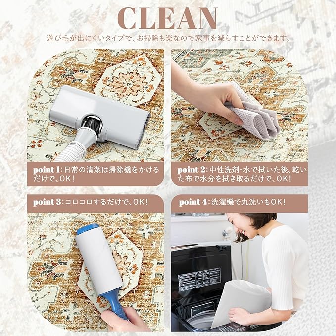 【お手入れ便利】毛足がないので、ゴミが絡みにくく、日常の清潔は粘着クリーナーをコロコロするや掃除機をか けるだけでキレイになります。また、汚れた場合は手洗いや洗濯ネットに入れて洗濯機で洗うことができます(ご 注意:風通しの良いところで陰干しし、アイロン、乾燥機の使用をお避け下さい。)