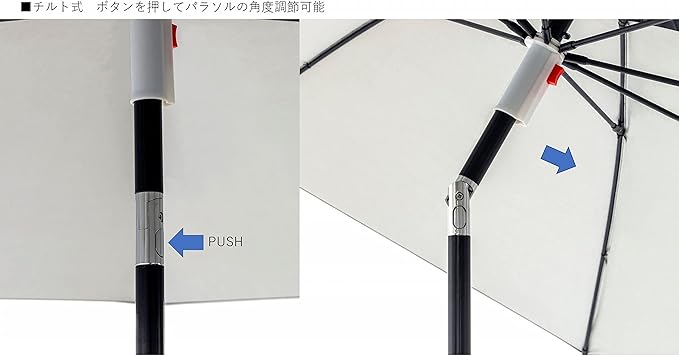 【チルト式】ボタンを押してパラソル上部を傾けられる。