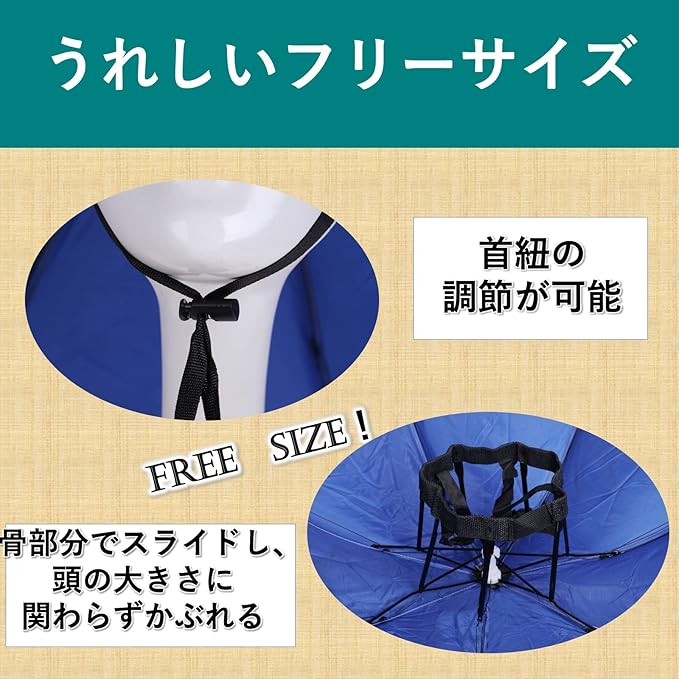 傘の骨の部分で固定する紐をスライドさせて、頭周りのサイズを変更できます。お子さまから大人までサイズの調整が可能です。ご自身に合ったサイズで使えるので、頭への負担も軽減します。