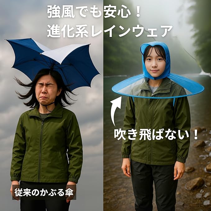 従来の頭に装着する傘との違い:一般的な頭に装着するタイプの傘は、頭部への固定が弱く、風が強いと傘がズレたり外れたりしやすい設計ですが、本製品は頭にしっかりとフィットし、風が吹いてもズレにくい構造になっています。
