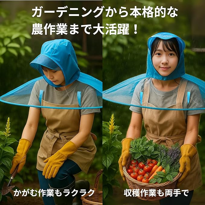 用途:釣り、農作業、アウトドア、ガーデニング、キャンプなどの活動時に、両手を自由に使いたい場面での雨対策