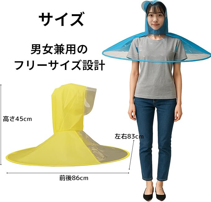 アウトドアや釣りなど、両手を自由に使いたいあなたにぴったりの頭からかぶるタイプの雨具です。 軽量で使いやすく、従来の傘のように風でズレる心配もありません。 雨の日の外出や作業をもっと快適にするための新しいアイテムです。 特徴: ・軽量設計: 従来の頭に装着するタイプの傘よりも軽く、長時間の使用でも負担になりません。 風に強いフィット感: 頭にしっかりフィットし、強風でもズレにくい設計で、安心して使用できます。 ・透明デザイン: 視界を遮らない透明な素材を使用し、雨をしっかり防ぎながら周囲の状況を確認しやすくしています。 ・折り畳み式: コンパクトに折り畳めるので、持ち運びや収納も簡単です。 釣り、キャンプ、ガーデニングなど、さまざまなシーンで活躍します。 いつでもどこでも、両手を自由に使いながら雨をしっかり防ぎます。 この雨具で、アウトドアをもっと快適に楽しみましょう!