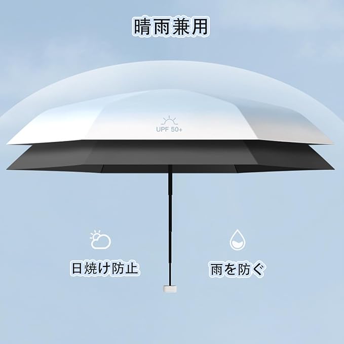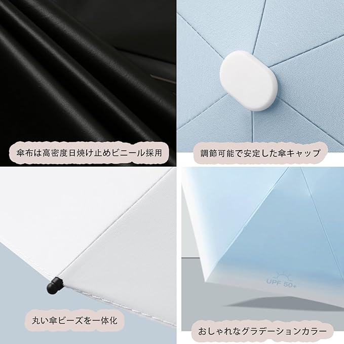 ☂【完全遮光 & UVカット】多層遮断生地で加工され、遮光率・UVカット率ともに100%、紫外線防止指数最高値UPF50+を実現し、日差しからお肌を守ります。炎天下でも強い紫外線を反射してまったく通さず、傘の裏地は黒で地面からの照り返しを吸収するので顔にあたりづらくなるので、顔の日焼けも防いでくれます。