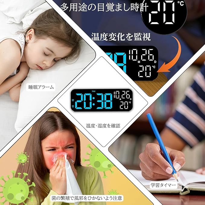 【音声感知機能でスマートな操作を実現】声や物音に反応して自動的にLEDディスプレイを点灯させるボイスコントロール機能を搭載。暗い中でボタンを探す必要がなく、16秒間表示後に自動消灯するので、就寝中や夜間の使用に非常に便利です。