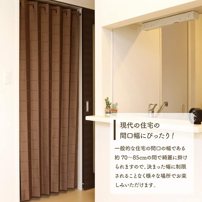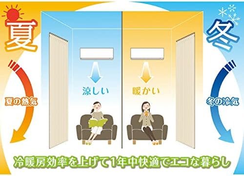 【ポイント】パタパタとコンパクトに折りたためる便利なカーテン!リビング キッチン ドア 階段 玄関 等の間仕切り、目隠しとしてお部屋のすきま風を防止し冷暖房効率をアップさせるecoな商品です。使用しないときは10㎝程度にたたんでおけますので通り抜けの邪魔になりません。レース生地ですので程よい透け感があり圧迫感も軽減します。