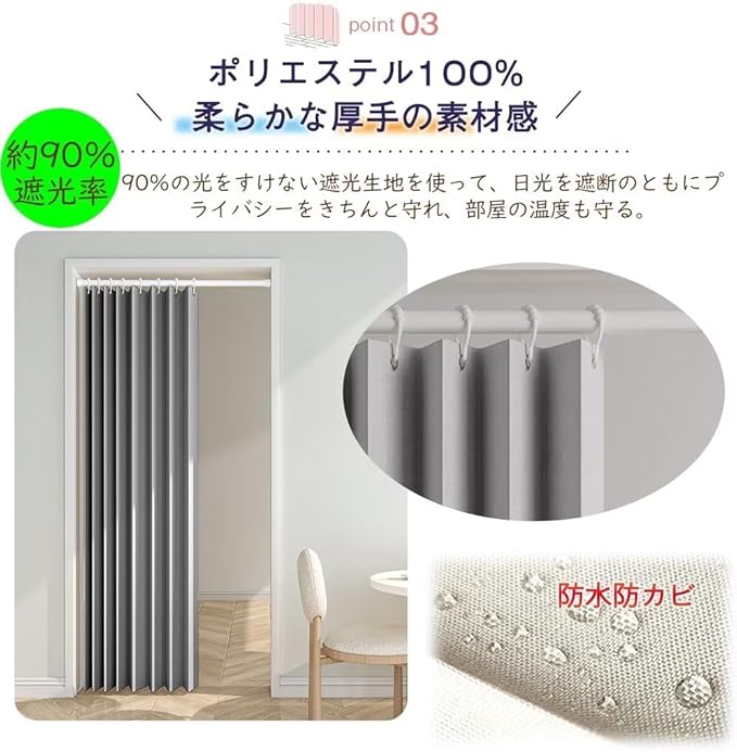 【専用リング付き・取り付け簡単!】:フックなどは不要です。一般的な突っ張り棒を通すだけで簡単に設置できるアコーディオンカーテン。 ◆リング直径:(約)4cm ◆上部リング部分がナノミュートリングでカラカラ音がせず、開け閉めの横滑りがスムーズに動かせます。不要な時は畳んでおけば、場所をとりません。