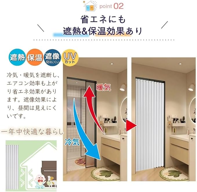 【遮光・省エネで快適】:断熱+保温+遮光+冷気遮断+省エネ リビング階段などの冷気、暖気の遮断にも最適で簡単に目隠しや間仕切りになる間仕切りカーテン。キッチンなど水や油などの汚れが気になる場所でも、定期的にお洗濯することで清潔感なのれんを保って頂けます。