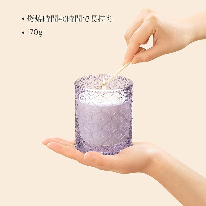 サイズと燃焼時間 : 170 グラム。自然由来ワックスとリードフリーのコットンウィックでクリーンにお楽しみいただけます。燃焼時間40時間。クルエルティーフリー、防腐剤フリー