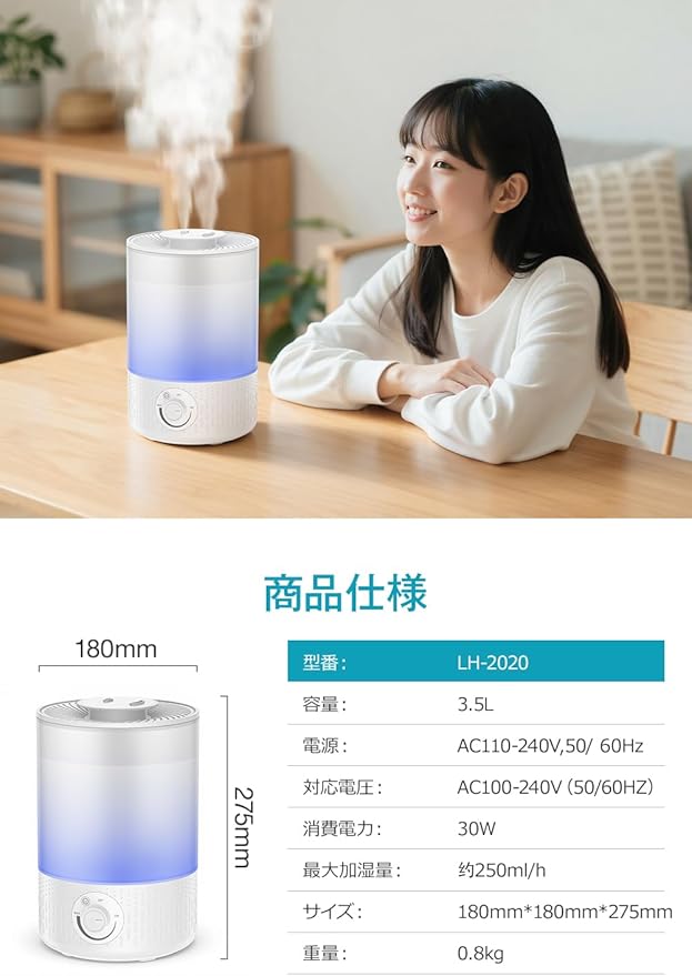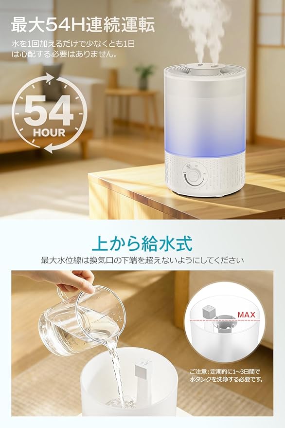 【3.5L大容量加湿器・最長54時間連続運転】3.5Lのビッグタンクを搭載し、一度の給水で最長54時間の連続加湿が可能。夜間や長時間の在宅ワークでも水切れを心配する必要はありません。リビングから寝室、広めのオフィスまで幅広い空間に対応できる、大容量設計です。
