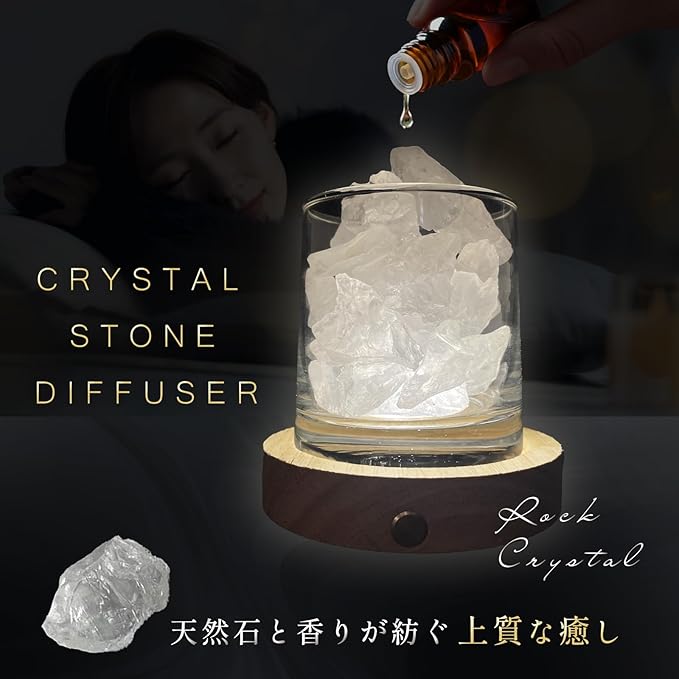 【セット内容】アロマストーン[ ロッククリスタル](約330g)、充電式LED台座、USBケーブル、グラス、アロマオイル[ブルーベル](10ml)、ベルベット調巾着、取扱説明書。