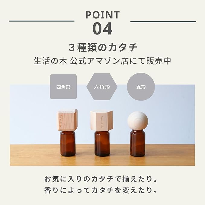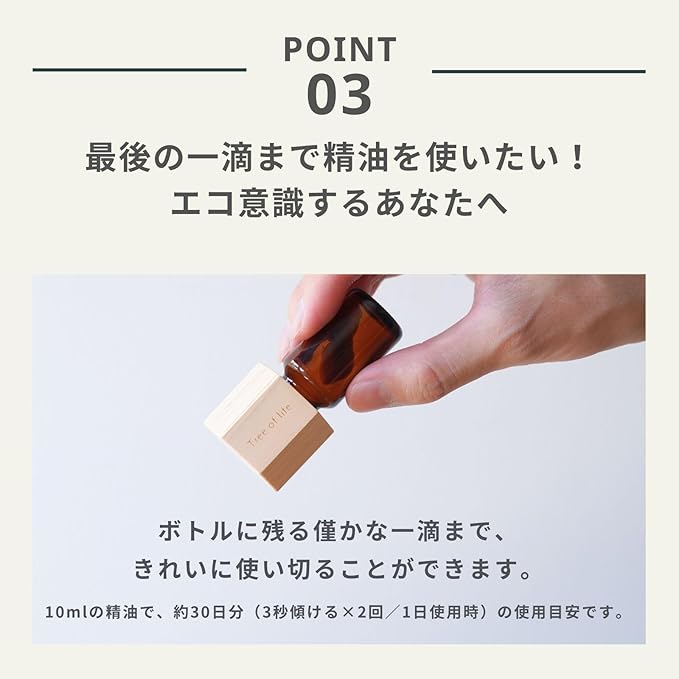 エッセンシャルオイル(精油)瓶のキャップと付け替え、瓶をそっと傾けると優しくアロマが広がります。