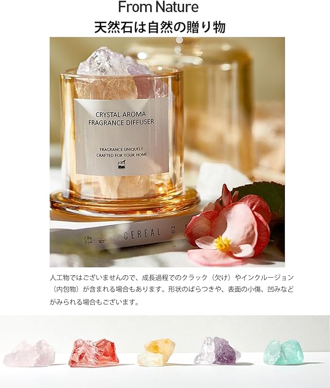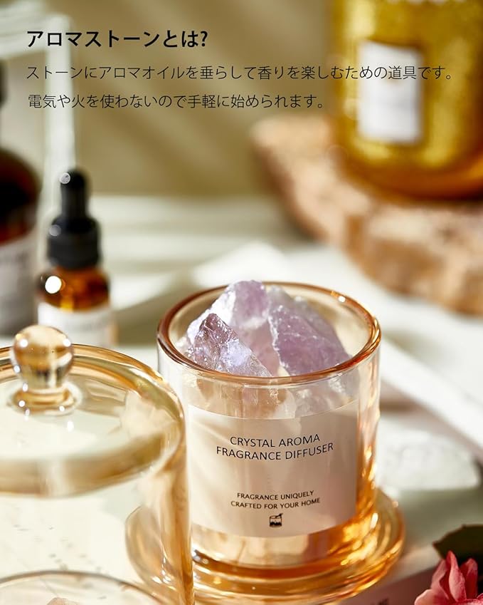 【天然石・ストーンディフューザー】エッセンシャルオイルをストーンに数滴垂らすだけで、天然石からふわっと広がる優しい香りが、お部屋全体に広がります。濃い香りが好きお好みの場合は、1回に8 ~ 12滴のエッセンシャルオイルを追加し、軽い香りがお好みの場合は、1回に5 ~ 8滴のエッセンシャルオイルを追加します。天然鉱物のアロマストーンはオイルを吸収し、熱なしでゆっくりと香りを拡散させます。香り立ちは穏やかなので、強い香りが苦手な方や、場所を問わずに設置でき、特にトイレ、洗面所、玄関などの狭くて目に留まる場所がおすすめです。