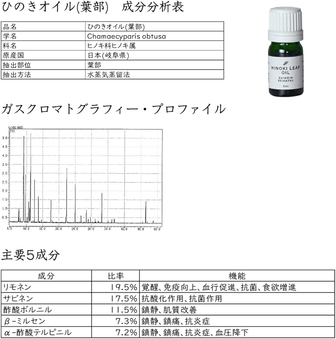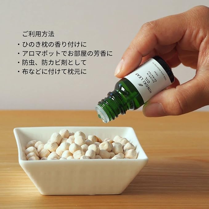 一般的に流通しているひのきオイルは「木部」から抽出したものが多いですが、本品はひのきの「葉部」から抽出した「ひのき葉オイル」となります。 葉部は木部と比較し抽出コストがかかるため高価となりますが、木部のような苦みが無く、甘みを含んだ上質な香りがします。