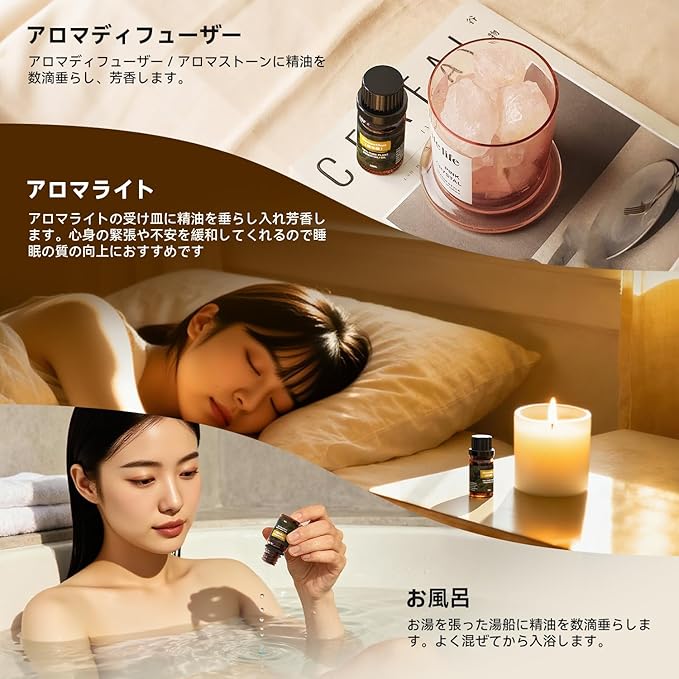 【多用途のアロマテラピー】アロマディフューザーやアロマポット、素焼きストーン、加湿器にお好みのアロマオイルを数滴加えると、香りが室内に広がり、快適な空間を演出します。1滴は約0.05mlなので、使いやすく量の調整がしやすいです。お好みの香りで日常を彩りましょう。アロマ初心者からよくエッセンシャルオイルを使用している専門家までオススメの精油です。