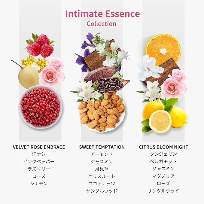 「Sweet Temptation」アーモンド、ジャスミン、月見草、オリスルート、ココアナッツ、サンダルウッドをベースにして、アーモンドの甘さ、ジャスミンの優雅さ、チュベローズの華やかさ、オリスの繊細さ、カカオの豊かさ、サンダルウッドの深みが調和し、ソフトなフローラルから温かみのあるウッドまで、豊かで心地よい香りが広がります