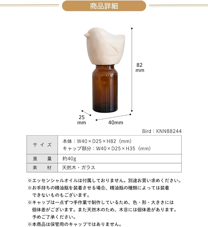 ✅『ご注意』※エッセンシャルオイルは付属しておりません。別途お買い求めください。※お手持ちの精油瓶を装着させる場合、精油瓶の種類によっては装着できないものもございます。※キャップは一点ずつ手作業で制作しているため、色・形・大きさには個体差がございます。また天然木のため、木目には個体差があります。予めご了承ください。※本商品は保管用のキャップではありません。