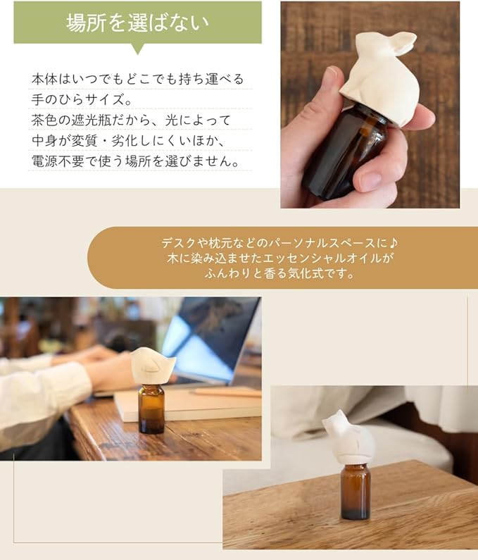 ✅『火も水も電気も使わないお手軽アロマ』付属の精油瓶にお好みのエッセンシャルオイルを入れるか、お手持ちの精油瓶を取り付けて、ボトルをそっと傾けるだけ。天然木にエッセンシャルオイルが染み込んで、枕元やデスクなどのパーソナルスペースに優しく香りが広がります。