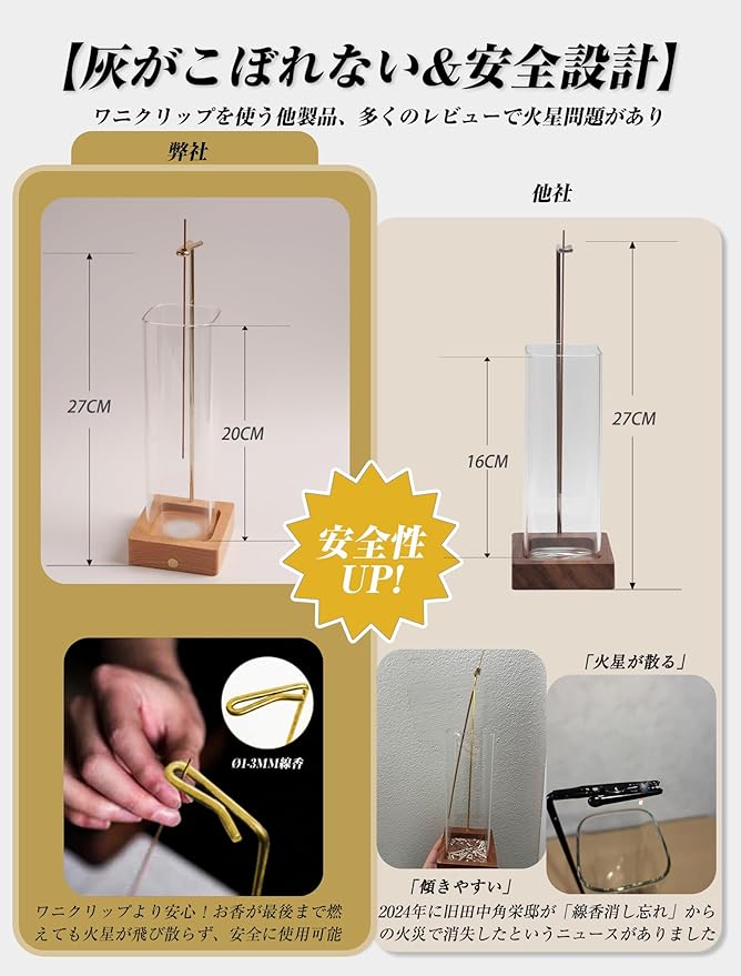 【灰が散らばらない】このお香立ては、通常のものよりも高いガラスカップが付属しており、お香が最後まで燃焼しても灰が外に落ちることはありません。より快適で安心した香道体験を提供します。