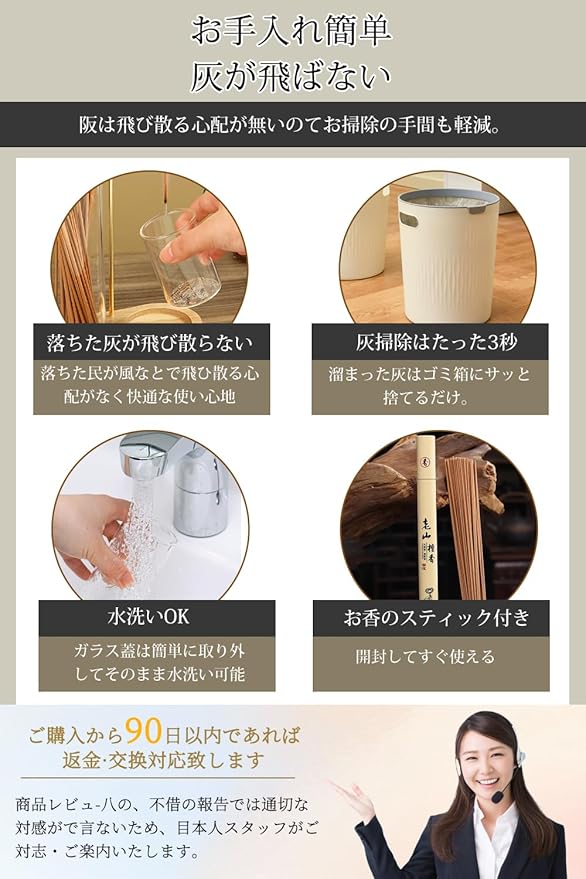 【灰こぼれ防止設計で、お手入れも簡単】 高水位灰こぼれ防止設計を採用し、灰がトレイ内に効果的に留まり、飛散を防ぎます。トレイは簡単に取り外して洗えるため、香立てを常に清潔に保ち、より快適な使用体験を提供します。