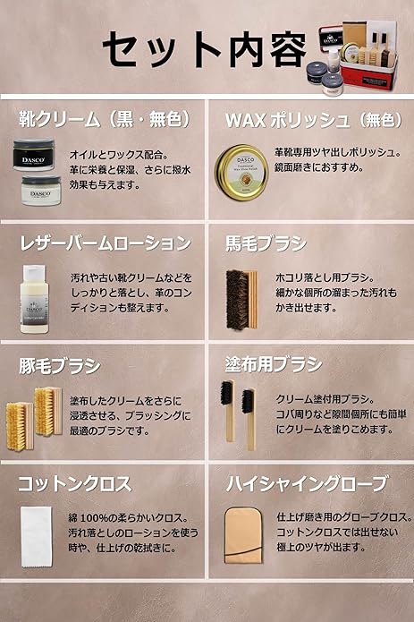 【初心者でも安心。みがき方ガイド】写真入りでわかりやすいガイドで、初心者でも迷わず使用できます。プロのような鏡面仕上げができるポリッシュまで入って、靴磨き上級者も満足。