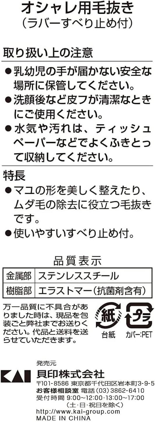 モデル名 貝印 オシャレ 毛抜き ピンセット ラバーすべり止め付き HL0405