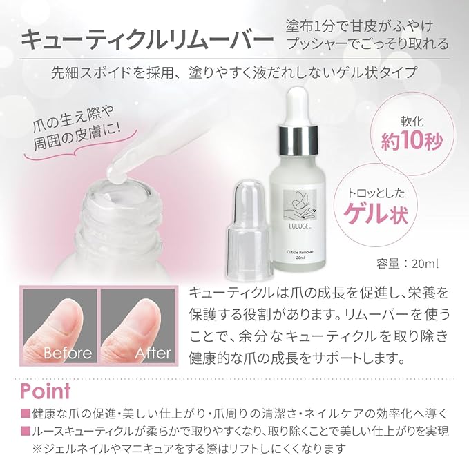 【LULUGEL キューティクルリムーバー】ジェル状で液だれしにくく、速攻タイプなので爪 甘皮処理を効率よく迅速に行えます。ネイル プッシャーがなくても、簡単に甘皮を除去でき、爪ケアの時短に最適です。