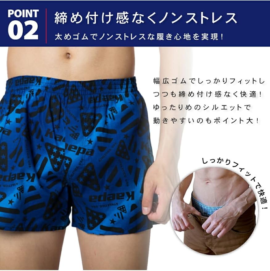 [デザイン] Kaepaのトランクスは、アメリカンスポーツのスピリットを反映したデザインで、カラーバリエーションも豊富にご用意しています。 レッド、ブラック、ブルー、パープル、グレーなど、様々な色をお楽しみいただけます。 履き心地に妥協はなく、太めのゴムウエストバンドが体にフィットしながらも締め付け感を排除し、ゆったりしたシルエットで動きやすさを実現します。 色や柄はアソートでおまかせになります。 商品画像は参考であり、実際の商品と異なる場合があることをご了承ください。