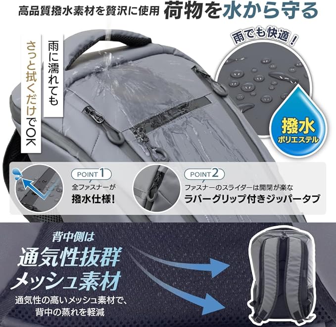 ✅【高機能素材】撥水性・耐摩耗性に優れた「ハイドロライトポリエステル」を使用し、通勤・通学・出張などのあらゆるシーンで活躍する高機能バックパックです。急な雨にも対応できる防水性能があり、大切なPCや資料をしっかり保護。表面が濡れても水を弾くため、汚れてもタオルなどで軽く拭き取るだけで手入れが完了します。また、背面にはキャリーオンバンドを備えており、スーツケースにセットして出張や旅行にも持ち運びやすい仕様です。