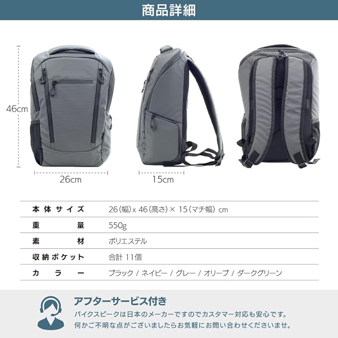 ✅【商品スペック】容量:約20L /重量:550g/幅:26cm/高さ:46cm/マチ:15cm/ポケット数:11ポケット/素材:ハイドロライトポリエステル/ジッパータイプ:オール撥水ファスナー/