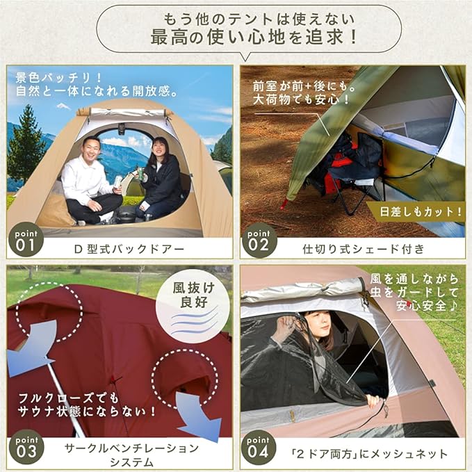 ✅【最高の使い心地、快適さを追求しました】”デザイン”も”機能性”もとことん追求しました。【D型式バックドア―】を前後両方のドアに設置することで、テント内を風が通り抜けるだけでなく、テント内にいながら景色を満喫できる空間作りを実現!【仕切り式シェード】をちょっとした荷物を置く後室として使うことで、前室を広く確保でき、快適なキッチンスペースやくつろぎ空間として使用することが可能に!【サークルベンチレーション】を開くことで、室内の空気循環を促すため、ドアを閉じた状態でもテント内が蒸し暑くならず、より良い環境で過ごすことが可能!【メッシュネット】を前後両方のドアに設置することで、夏場のキャンプで気になる虫の侵入を防ぎながらも、風通しは良く、ゆったりのんびりとした時間を過ごせます!
