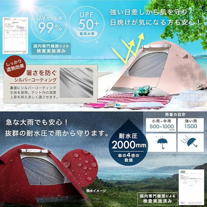✅【抜群の紫外線カット / 雨水を通さない防水性】生地には耐久性に優れた190Tのポリエステルを採用!裏面には遮光性を高めるシルバーコーティングが施されてるため、日焼けの原因となる紫外線を99%カットし、紫外線遮蔽率はUPF50+を実現。いかなる天候にも耐え、色あせやひび割れ、摩擦に強く、強度、耐久性を備えています。【耐水圧2000mm】テントの性能を表す耐水圧は大雨に耐えられる2000mmもあるので、急な雨や夜露で生地が濡れる心配もありません。また通気性もよく、湿気は適度に外に逃すため、悪天候対策と快適な居住空間の確保を同時に叶えます!