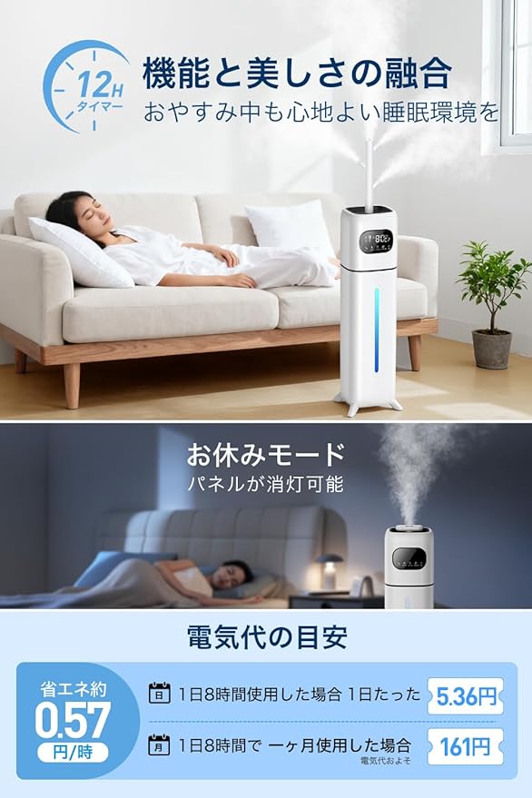 【12Hタイマー タッチパネル・リモコン付き】切り忘れ防止のタイマー機能が搭載され、1時間刻みで最大12時間まで設定できます。タイマーがなくなる場合、また、タンク内に水が切れる場合、加湿器が自動運転停止になるため、消し忘れや空焚きがなく、外出時も就寝時も安心。タッチ式パネルを採用し、軽く触れるだけで電源オン/オフ、運転モード切り替えなど様々な機能を操作できます。もちろん、付属のリモコンで、ソファやベッドの上でゆっくりくつろいだままでも遠隔操作可能!広口設計にパーツ分解可能、隅々まできれいに掃除でき、お手入れもしやすいです。