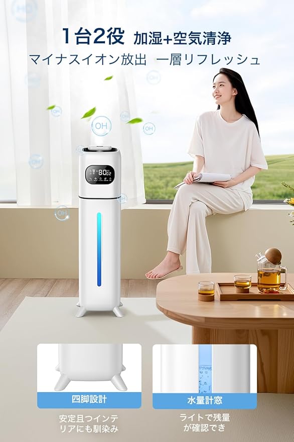 【多重除菌・空気清浄 ハイブリッド加湿器】①水を加熱することで高温除菌を行うことができます。②UV除菌ライトを内蔵し、水の雑菌を効率よく除去可能。③麦飯石フィルターは雑菌を吸着除去して水の浄化をサポート。④空間加湿と同時にマイナスイオンを放出することも可能、嫌なニオイを防ぎ、お部屋の空気をリフレッシュ。⑤吸い上げポンプでタンク内の水を汲み上げてくる仕組み、どんどん濾過される水循環システムなので、水をより清潔にして、常にきれいなミストを吹き出し、空気が快適でうるおいたっぷりなリラックス空間を作ることができます。