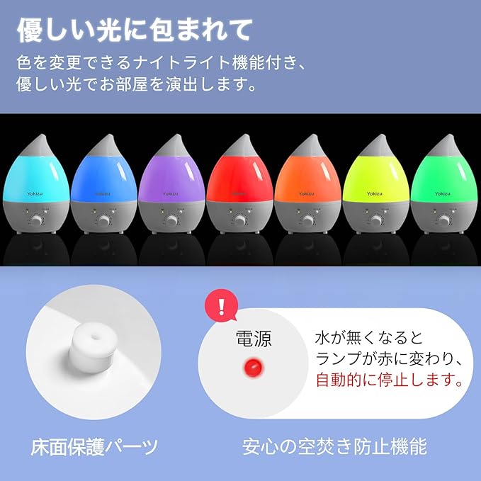 【静音・アロマ対応・LEDライト搭載】図書館よりも静かな28dB以下の運転音で深夜でも気にならない低騒音設計です。敏感で音が気になる方でもぐっすり眠れます。赤ちゃんの部屋、会社などにもご利用いただけます。アロマオイルをアロマトレーに垂らせばお好みの香りが部屋全体に広がります。さらにナイトライトは7色に変化し、美しい夜の雰囲気を作りだしましょう。便利な消灯機能:LEDライトボタンを2~3秒を押し続けると消灯します。