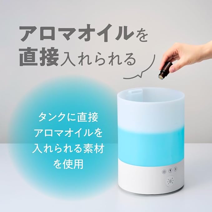 アロマオイルを直接入れられる。タンクに直接アロマオイルを入れられる素材を使用。見やすく操作しやすいタッチスイッチ。
