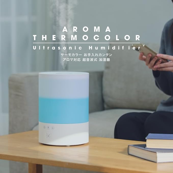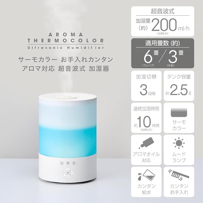 ドウシシャ 加湿器 超音波式 サーモカラー プレハブ 6畳 木造 3畳 容量 2.5L 3段階切替 アロマ対応 ホワイト KWA-202WH