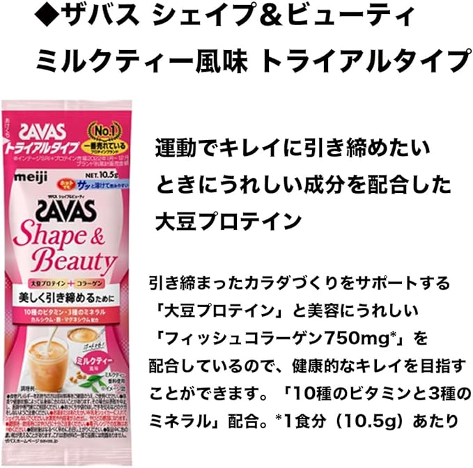 【ザバス シェイプ&ビューティ ミルクティー風味 トライアルタイプ 10.5g】 脱脂大豆たんぱく(国内製造)、デキストリン、魚コラーゲンペプチド、紅茶エキスパウダー、食塩/炭酸Ca、炭酸Mg、増粘剤(プルラン)、カラメル色素、V.C、乳化剤、香料、甘味料(スクラロース、アスパルテーム・L-フェニルアラニン化合物、アセスルファムK)、ピロリン酸第二鉄、調味料(アミノ酸等)、V.E、V.B2、V.B6、パントテン酸Ca、V.B1、ナイアシン、V.A、V.D、V.B12、(一部に乳成分・大豆・ゼラチンを含む)