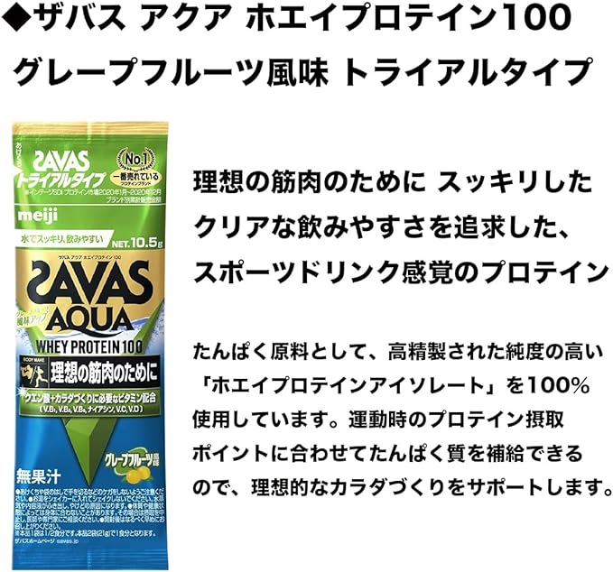 【ザバス アクア ホエイプロテイン100 グレープフルーツ風味 トライアルタイプ 10.5g】 乳清たんぱく(イギリス製造)、砂糖/クエン酸、クエン酸Na、乳化剤、増粘剤(プルラン)、甘味料(アスパルテーム・L-フェニルアラニン化合物、スクラロース、アセスルファムK)、V.C、香料、V.B2、V.B6、V.B1、ナイアシン、V.D、(一部に乳成分・大豆を含む)