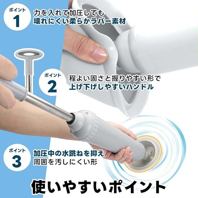 従来のスッポンと比べ、空気漏れがなく十分な加圧がかかる仕組みに