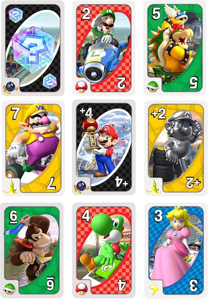 【内容】世界中で大人気のゲーム「マリオカート」がウノになって新登場。カードにはキノコやバナナ、ミドリのこうら、サンダー、ボムへいなど、特殊な効果を持ったアイテムのアイコンが入っていて、「ワイルドアイテムボックスカード」が出された場合に、その効果を発揮できるスペシャルルール。