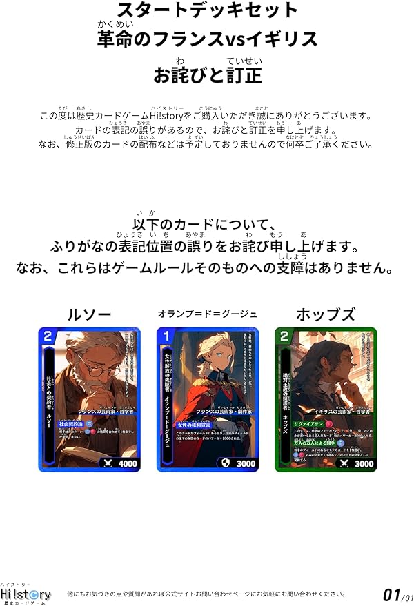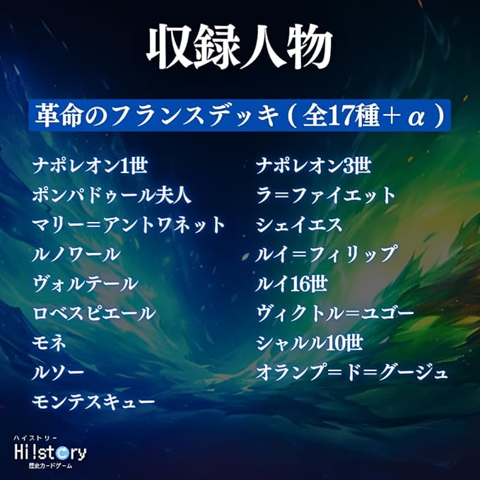 ◆内容物 革命のフランスデッキ 1 (32枚) 革命のイギリスデッキ 1 (32枚) 説明カード (1枚) ルール説明書 (3枚) ◆収録人物一覧は公式HPからご覧ください