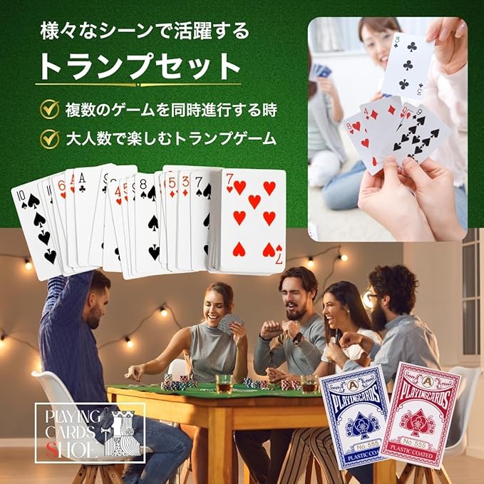 【大人数でもスムーズに遊べる!カードシュー付き6パックトランプセット】 本製品は、青と赤のトランプ6パックに加え、カードをスムーズに配れる専用カードシューが付いた実用的なセットです。カードシューを使うことで大人数でのゲームやイベントでもテンポ良く進行できます。【セット内容】トランプ6個(青3個/赤3個)、カードシュー1個【サイズ】トランプ:約9㎝ 6㎝、カードシュー:約10㎝ 25㎝ 10.5㎝
