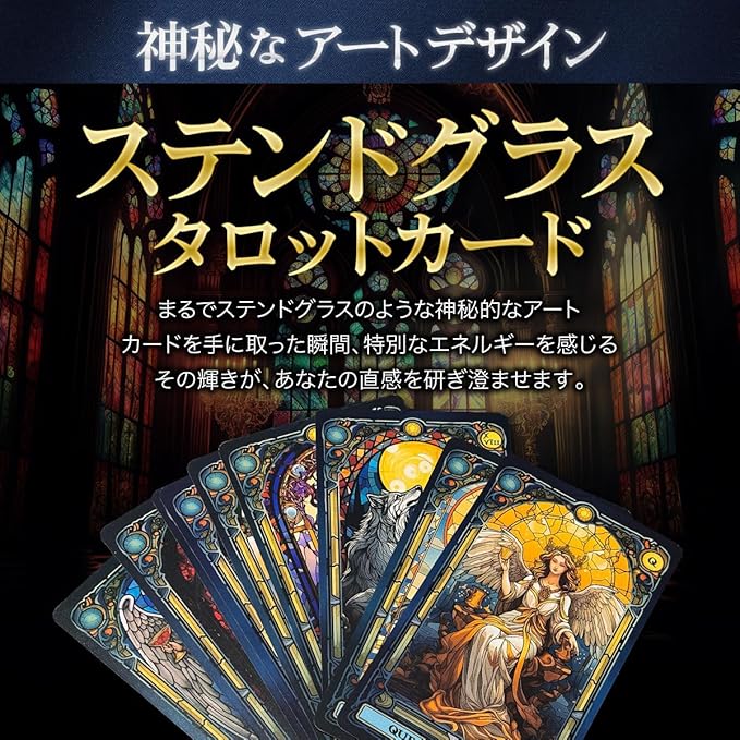 ステンドグラスを背景にした中世ファンタジーの美麗イラストが彩るタロットカード。その美しさは、使用者のインスピレーションに強く働きかけるでしょう。