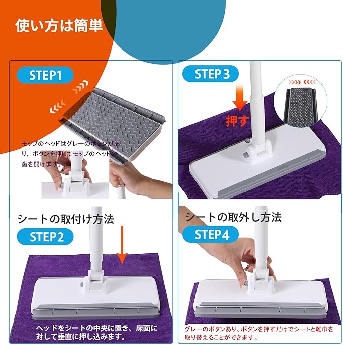 【自動で雑巾を挟むモップの操作説明】シートと雑巾の取付け方法:フロアワイパーのヘッドをシートの中央に置き、床面に対して垂直に押し込みます。シートと雑巾取外し方法:フロアワイパーのヘッドにはグレーのボタンあり、ボタンを押すだけでシートと雑巾を取り替えることができます。(操作の説明と使用方法の説明をビデオで見ることができます。)