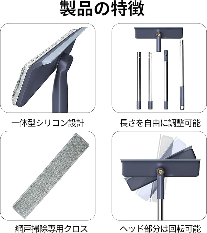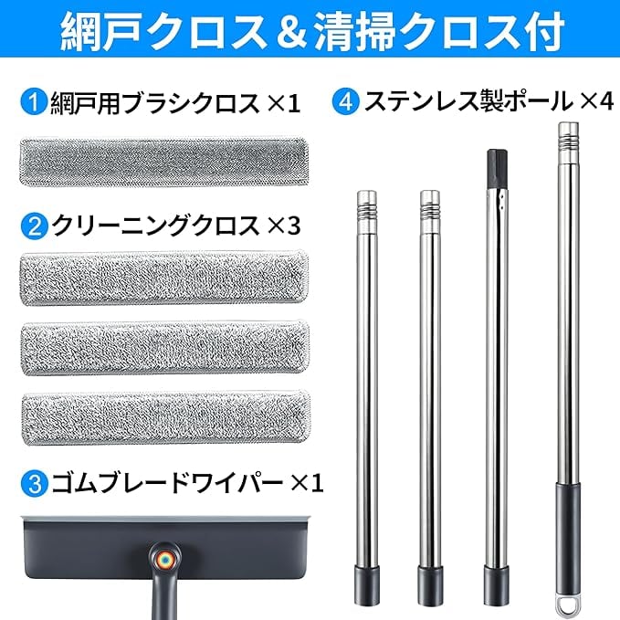【モップクロス3枚+網戸用クロスで多機能対応】 交換用モップ3枚と網戸専用クロス付きで、窓や網戸の汚れ・ホコリを効率的に除去。水洗い可能で繰り返し使え、コスパも◎。