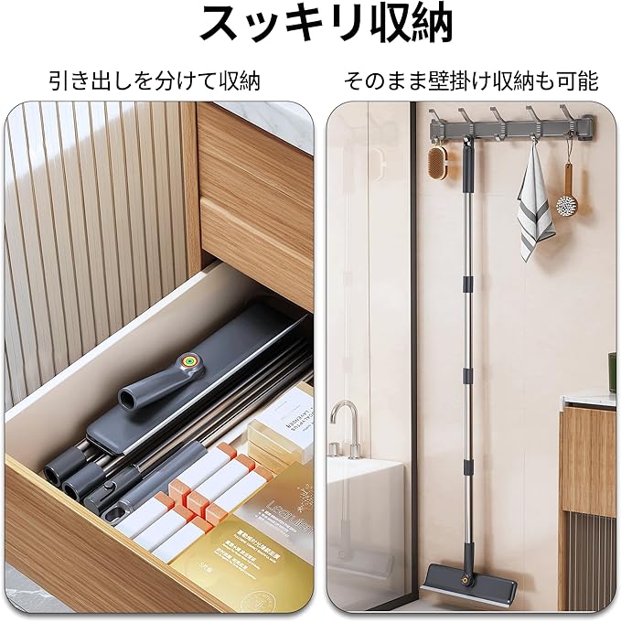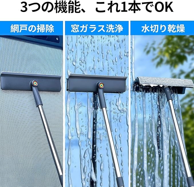 【家中どこでも使える多用途&省スペース収納】 窓、浴室、車のガラス、網戸など幅広く対応。分解収納可能で、壁掛け収納もOK。コンパクトに収まり、収納場所に困りません。